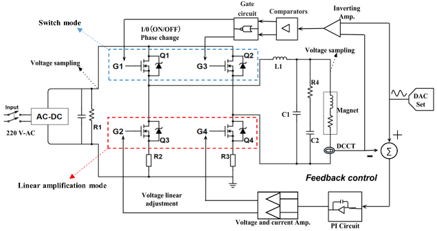 电子加速器装置运行时,多种因素会导致束流轨道偏离正常值,以及束流轨道的快速震荡。研制出响应速度快、调节精度高、稳定性好的校正磁铁电源对轨道反馈系统乃至最终同步辐射光源的品质有重要意义。由于磁铁负载的电感特性,常规的电源功率变换拓扑结构存在一定的局限性,主要体现在电源输出响应速度和输出电流稳定性之间存在矛盾、输出电流分辨率不够高等。该研究调研对比了多种电源拓扑结构,首次提出了一种基于MOSFET线性工作区的“类H桥”结构如图1、2所示。利用了MOSFET工作在线性区以及H桥结构的换相作用,成功研制出了响应快、高稳定性的双极性电源样机。样机测试结果显示,该电源的小信号带宽可以达到10 kHz, 8小时长期稳定度优于10 ppm,输出电流分辨率优于10 ppm,满足了合肥先进光源预研工程需求。