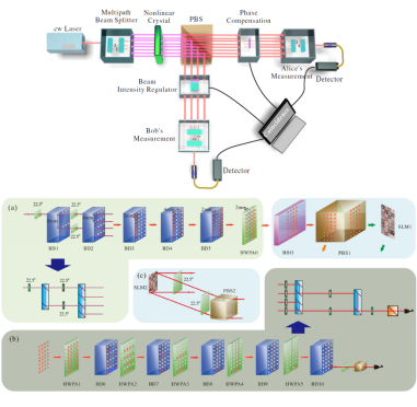 图1、上图为实验装置示意图。下图则展示了紧凑的光学分束器以及利用空间光调制器进行调制的过程。