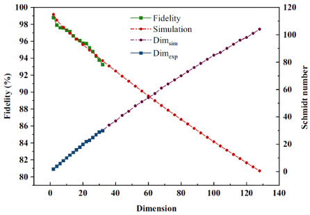 图2、纠缠态保真度随维度变化曲线。理论模拟结果展示了实验方案的可扩展性。