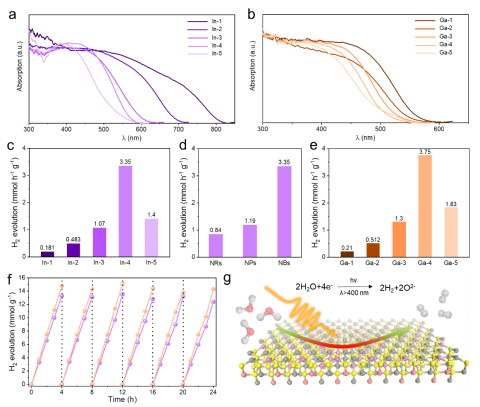 图2. CZIS和CZGS纳米带的光学和光催化性能。(a-b)近紫外-可见光吸收光谱图。(c)不同Zn含量的CZIS纳米带的光催化产氢性能。(d)CZIS纳米带、纳米颗粒和纳米棒的光催化产氢性能。(e)不同Zn含量的CZGS纳米带的光催化产氢性能。(f)CZIS和CZGS纳米晶的循环稳定性。(g)CZIS纳米带光催化产氢示意图。
