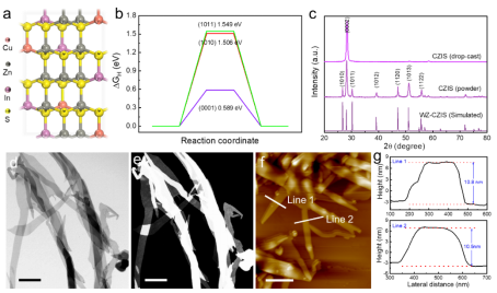 图1. DFT计算和CZIS纳米带的结构和形貌表征。(a)晶体结构示意图。(b)(0001)、(1010)和(1011)晶面的光催化析氢反应吉布斯自由能。(c)XRD图。(d-e)TEM图。(f-g)AFM图和相应的高度统计图。