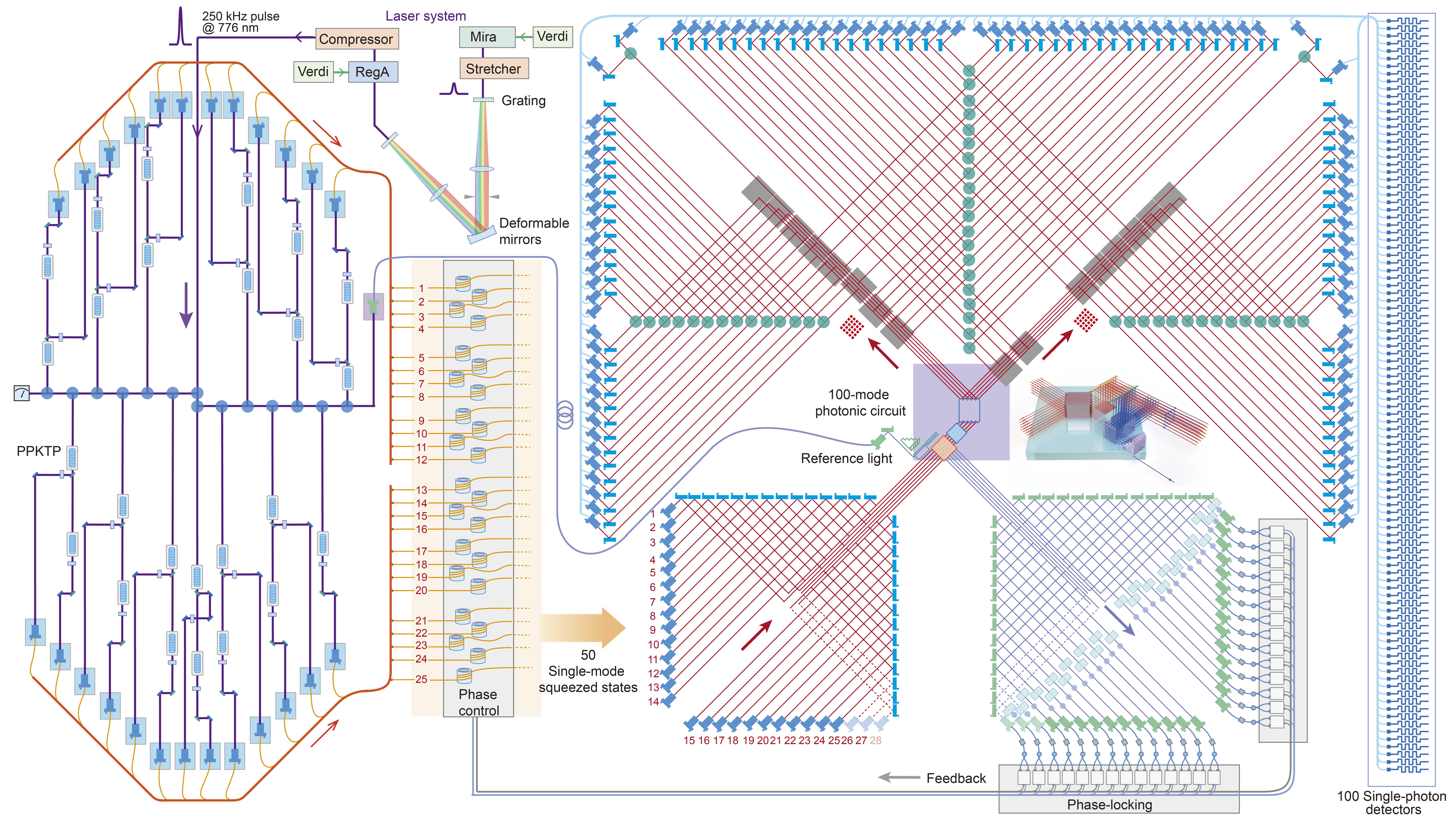 图片1:“九章”量子计算原型机光路系统原理图 :左上方激光系统产生高峰值功率飞秒脉冲; 左方25个光源通过参量下转换过程产生50路单模压缩态输入到右方100模式光量子干涉网络; 最后利用100个高效率超导单光子探测器对干涉仪输出光量子态进行探测。(制图:陆朝阳,彭礼超)