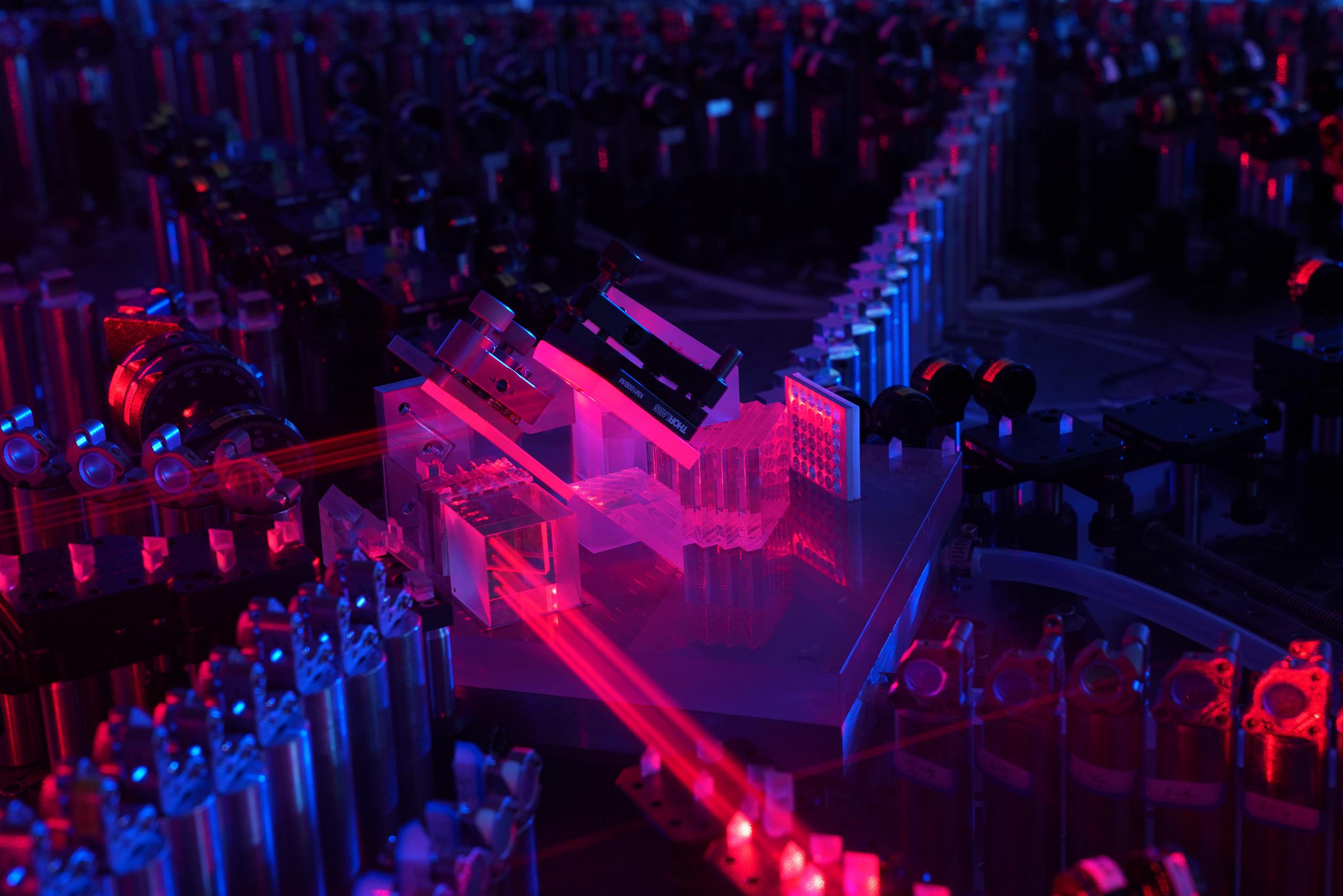 图片2:光量子干涉实物图:左下方为输入光学部分,右下方为锁相光路,上方共输出100个光学模式,分别通过低损耗单模光纤与100超导单光子探测器连接。(摄影:马潇汉,梁竞,邓宇皓)