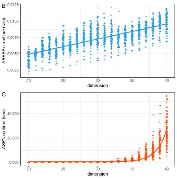 图一算法的计算时间随着变量个数增加的散点图。其中上图是新提出的算法,下图是经典的最优子集选取算法。
