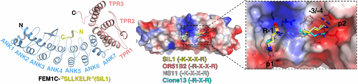 许超课题组针对Cul2 E3连接酶复合物中的受体蛋白质FEM1家族成员FEM1A、FEM1B、FEM1C开展研究。首先通过结合实验发现FEM1蛋白质均通过氨基端含锚蛋白重复(ankyrin repeats)的区域识别含羧基精氨酸的C-degron (Arg/C-degron),但FEM1A/C与FEM1B体现出了不同的序列偏好性。我们首先解析了FEM1C分别与SIL1、NS11、OR51B2、Clone13的Arg/C-degron的4个复合物晶体结构,通过结构分析发现FEM1C通过双位点模式特异识别含-K/R-X1-2-R的Arg/C-degron;进而解析了FEM1B和CDK5R1 C-degron的复合物晶体结构,并与FEM1C复合物比较,揭示了FEM1B识别CDK5R1 C-degron的-G-L-X-R序列的分子机制。基于结构,我们不仅揭示了FEM1A/C与FEM1B底物不同选择性,还通过突变关键氨基酸将FEM1C向FEM1B改造,使突变后FEM1C偏好性从SIL1(K-X-X-R)转向CDK5R1(G-L-X-R)。最后我们在哺乳动物细胞中构建基于双荧光的蛋白质稳定性全局报告质粒系统(Global Protein Stability, GPS)。在GFP荧光蛋白质末端融合C-degron,发现任何削弱或者破坏C-degron和FEM1蛋白质相互作用的突变都会导致GFP更加稳定,通过体内实验验证了Cul2FEM1 通过识别蛋白质Arg/C-degron有效调控蛋白质泛素化降解过程。