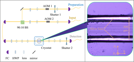 实验光路图和显微镜下集成量子存储器照片(右侧插图)