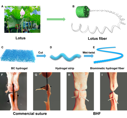 医用材料是一类具有高附加值的材料,目前市面上的高端医用材料大多依赖进口,价格十分昂贵,因此发展具有自主知识产权的国产高端医用材料迫在眉睫。近期,中国科学技术大学俞书宏院士团队基于“藕断丝连”这一自然现象,深入探究了莲丝纤维的微观结构与力学性能,并受此启发研制出了一种可用于手术缝线的仿莲丝细菌纤维素水凝胶纤维(图1)。