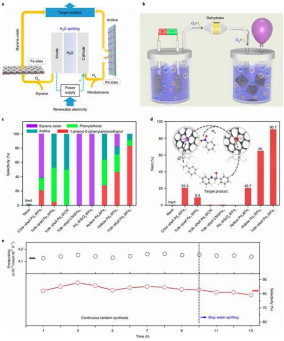 通过耦合电解水装置,设计并制作了一个集成的催化系统,用于直接合成氨基醇。如图4所示,在电化学反应过程中,小规模电解水实时生成O2和H2,并在有机合成反应中实时消耗。产生的H2和O2通过导气管流入右边的容器,分别通过Fe1和Pd1位点活化O2和H2,与苯乙烯和硝基苯反应生成1-苯基-2-(苯氨基)乙醇。吴宇恩教授进一步进行了连续循环测试,验证yolk-shellPd1@Fe1的稳定性。结果表明反应10小时后,产率和选择性没有发生明显变化。当关闭电解水装置后,由于气球中预先储存H2和O2,仍然可以继续反应3小时,其反应动力学和选择性仍可以保持。