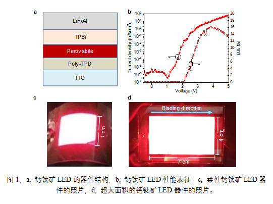 金属卤化物钙钛矿LED因为具有色域广、带隙易于调节、发光半峰宽窄、易于制备等优势,已经成为新一代的LED器件。2014年,首次报道了室温下发光的钙钛矿LED,其外量子效率(EQE)低于1%,短短几年内钙钛矿LED的EQE就已经超过了20%,接近于商用有机LED(OLED)的水平,在照明和显示领域展示出了广阔的应用前景。但是目前高效率的钙钛矿LED都是基于旋涂法制备而成的,器件面积都很小(mm2量级),无法满足大面积商业照明的需求。刮涂法是一种基于溶液法就能制备出大面积薄膜的方法,但是刮涂法制备钙钛矿薄膜的结晶过程不易控制,制备出来的钙钛矿LED的EQE最高仅为1.1%,其器件面积也仅为9 mm2。