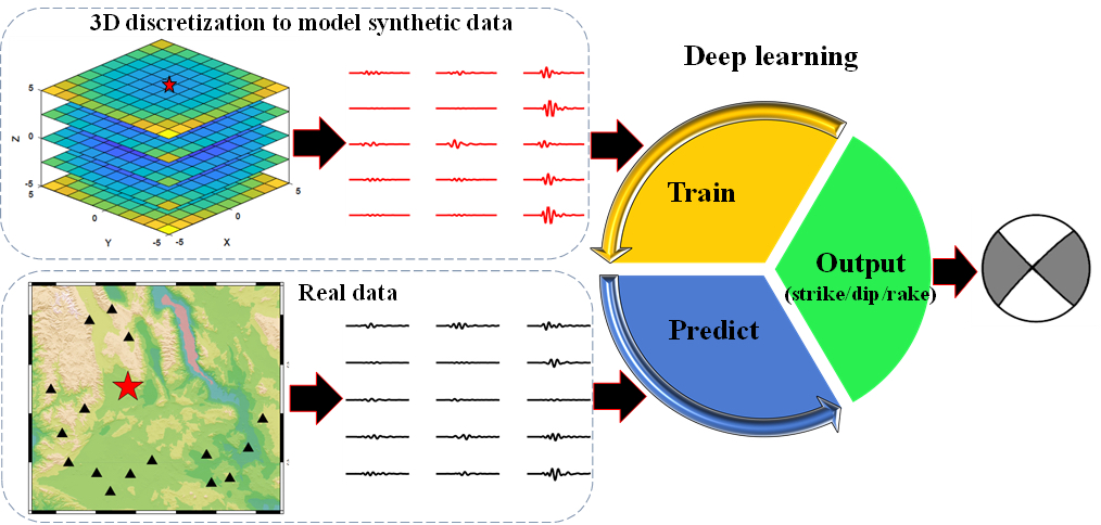 图1:采用地质模型计算的理论数据训练神经网络,当地震发生时,实际地震数据用于预测地震震源机制参数。