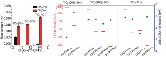 研究人员首先利用时间分辨原位漫反射红外光谱表征了TiO2纳米晶表面吸附甲醇和甲氧基物种光催化氧化反应动力学,观察到表面物种光催化氧化反应速率常数敏感依赖于表面位点。同一纳米晶表面,甲氧基物种光氧化反应性能优于甲醇;不同纳米晶表面,甲氧基物种光催化氧化反应性能随甲氧基/甲醇比例增加而提高。TiO2-{001}纳米晶表面表现最大的甲氧基:甲醇比例,因此其表面甲氧基表现出最高的光催化氧化反应活性,而表面甲醇为光催化氧化反应惰性。理论计算结果表明钛矿TiO2表面吸附甲醇物种及其能级结构与TiO2表面结构密切相关。在TiO2(001)表面主要生成4配位Ti吸附的CH3O(a)Ti4c物种和少量5配位Ti吸附的CH3OH(a)Ti5c物种;在TiO2(100)和(101)表面生成CH3OH(a)Ti5c、5配位Ti吸附的CH3O(a)Ti5c和少量与缺陷相关的甲氧基和甲醇物种。CH3O(a)Ti4c和CH3O(a)Ti5c的HOMO位于对应TiO2表面的价带顶,而其它物种的HOMO位于价带顶1eV以下。因此TiO2价带中的光生空穴更易转移至CH3O(a)Ti4c和CH3O(a)Ti5c物种并只能发生氧化反应,而转移至其它物种的光生空穴既可以发生氧化反应,也可以重新转移至TiO2价带。对应的瞬态吸收光谱结果证实甲醇-TiO2-{001}纳米晶界面仅发生TiO2纳米晶至甲醇的光生空穴转移过程,而甲醇-TiO2-{100}纳米晶和甲醇-TiO2-{101}纳米晶界面不仅发生TiO2纳米晶至甲醇的光生空穴转移过程,而且发生甲醇至TiO2纳米晶的光生空穴转移过程。同时,CH3O(a)物种增强TiO2表面能带向上弯曲,利于光生空穴向表面的扩散;而CH3OH(a)削弱TiO2表面能带向上弯曲,不利于光生空穴向表面的扩散。原位表面光电压谱结果证实具有最大的甲氧基/甲醇比例的甲醇/TiO2-{001}体系表现出最强的能带向上弯曲程度,因此其CH3O(a)Ti4c表现出最高的光催化氧化反应活性。