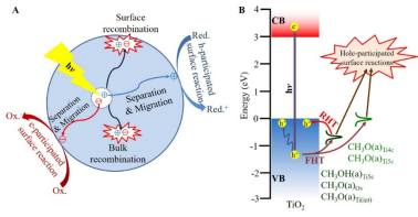 光催化利用绿色可持续太阳能驱动化学反应,从而受到广泛关注。光催化包括光催化剂吸收光并生成载流子、载流子分离并扩散至光催化剂表面、载流子与光催化剂表面物种发生氧化还原反应等步骤。前两个步骤发生在光催化剂体相,通过优化光催化剂结构来提高其效率获得了巨大进展。第三个步骤发生在光催化剂表面,涉及到光生电荷在吸附物种-光催化剂界面的转移,是光催化反应的速控步,但由于其复杂性,相关研究较少。