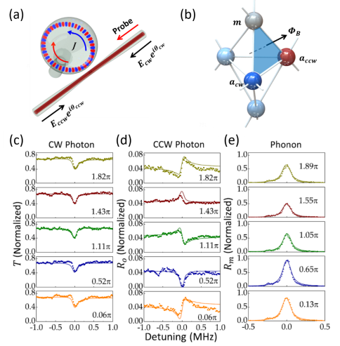 此前的研究都是通过多个微腔体系来构建这样一个几何相位实现人工规范场。而该团队首次利用单个微腔,通过微腔支持多模相互作用的特点,实现了合成规范场。利用光纤锥同时向微腔注入顺时针和逆时针的驱动光,可以实现光子与声子相干耦合且耦合相位完全可控。在实验中,他们证明光子在多个模式间耦合输运会获得与路径相关的相位差,从而实现了光子的等效合成磁场;进一步的发挥微腔光场调控的优势,也实现了时变的规范相位,从而首次在单个微腔中实现光子的合成电场。由于微腔里可以实现比较强的相干光机械耦合相互作用,以及相干的非线性光学效应,实验结果也预示了合成磁场可以在可控的情况下拓展到更高的维度,这个是在现实的晶格里还没实现的;此外,本实验中的合成规范场也有望用于研究光子的拓扑性质,实现手性边缘态和拓扑保护。
