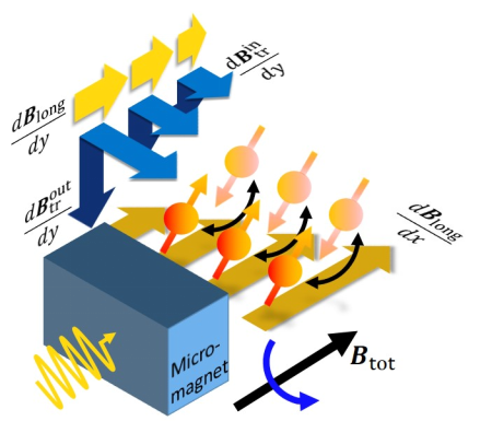为了抑制微磁体可能对比特操控的不利影响,传统的方法是优化微磁体形状的设计,增强横向磁场梯度的同时抑制纵向磁场梯度。然而,当量子比特阵列扩展起来之后,微磁体形状的优化设计受到阻碍。另一种更为有效的方法是原位调节磁场方向,例如已报道的在不含有微磁体的硅半导体量子点中,通过调节磁场方向可以有效改变本征自旋-轨道耦合的大小,改变比特操控频率、调节量子比特退相干时间,进而优化量子比特操控。然而,对于嵌入微磁体的硅量子点,通过调节微磁体性质进行量子比特操控优化的工作尚无相关报道。