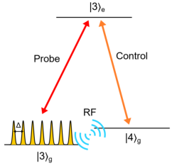 存储方案示意图,信号光场(probe)被梳状的原子吸收谱吸收,并被控制光场(control)存储为自旋激发,在射频(RF)场的操控下延长存储时间,最终读取为光信号。