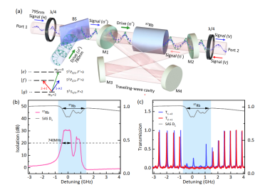 该研究组利用圆偏泵浦光将气室中的原子极化到一个特定的磁自旋态上,对不同偏振的光产生不同的吸收和色散,实现了约30dB的隔离比。在此基础上,研究组加入了一个行波腔,大幅增强了光与原子之间的相互作用,最终将隔离比提高到了51.5dB,成功地制备出了基于原子系综的非互易介质。这套系统有较好的鲁棒性,对于外界弱磁场的干扰、泵浦光频率和功率的浮动等均不敏感,具有实际应用的价值。