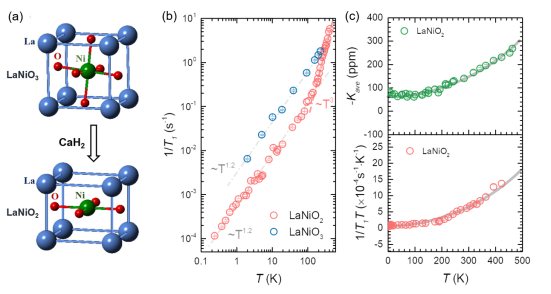 图:(a) LaNiO3和LaNiO2的晶体结构。通过CaH2还原LaNiO3可以得到LaNiO2。(b)LaNiO2和LaNiO3中自旋-晶格弛豫率(1/T1)随温度的变化关系。(c)上半图:LaNiO2的奈特位移(Ks)随温度变化的关系。下半图:LaNiO2中1/T1T随温度变化的曲线。