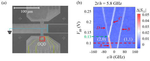 图(a)半导体量子点-微波谐振腔复合器件的电子显微镜示意图。红色方框是多个金属电极控制的半导体双量子点,蓝色线条标出的是微波谐振腔。图(b)微波谐振腔探测的双量子点激发态幅值谱。