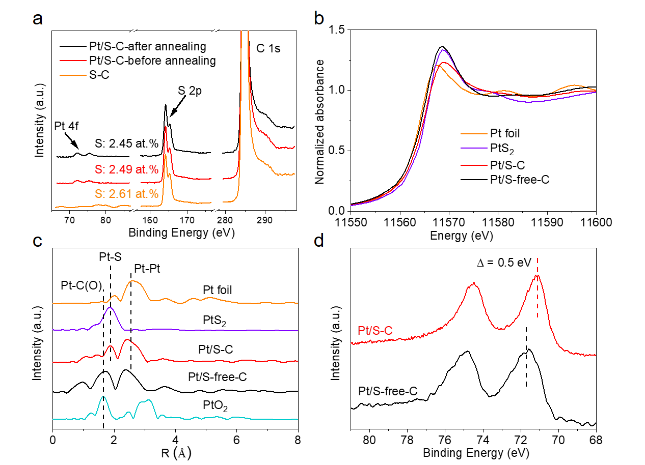 在前期工作中,研究人员发展了一种过渡金属催化碳化有机小分子制备多孔碳的方法(Nature Communications2015, 6, 7992;Science Advances2018,4, eaat0788)。使用该方法所制备的介孔S-C为载体,基于Pt和S-C载体之间的强相互作用,研究人员进一步发展了原子分散催化剂的合成方法(Science Advances2019, 5, eaax6322),并研究了金属和S-C载体之间电荷转移方向对金属尺寸的依赖性(Nature Communications2019, 10 , 4977)。在上述工作基础上,本项工作中研究人员进一步拓展了该S-C载负贵金属催化剂体系,发现了S-C载体在高温下稳定金属纳米团簇的特性。高角环形暗场透射电镜(HAADF-STEM)证明了相对于脱硫碳载体(S-free-C),S-C能够在700 °C高温下长时间稳定尺寸为1纳米左右的金属团簇而不发生烧结。该硫稳定策略同样适用于其它贵金属纳米团簇体系(Ru、Rh、Os、Ir),均表现出优异抗烧结能力。原位X-射线光电子能谱(in-situ XPS)和同步辐射X-射线吸收谱(XAFS)表征结果表明,该高温抗烧结能力源自于Pt和碳载体上掺杂的硫原子之间的强键合作用,并发现S-C载体对Pt纳米团簇存在电荷补偿转移(图2)。