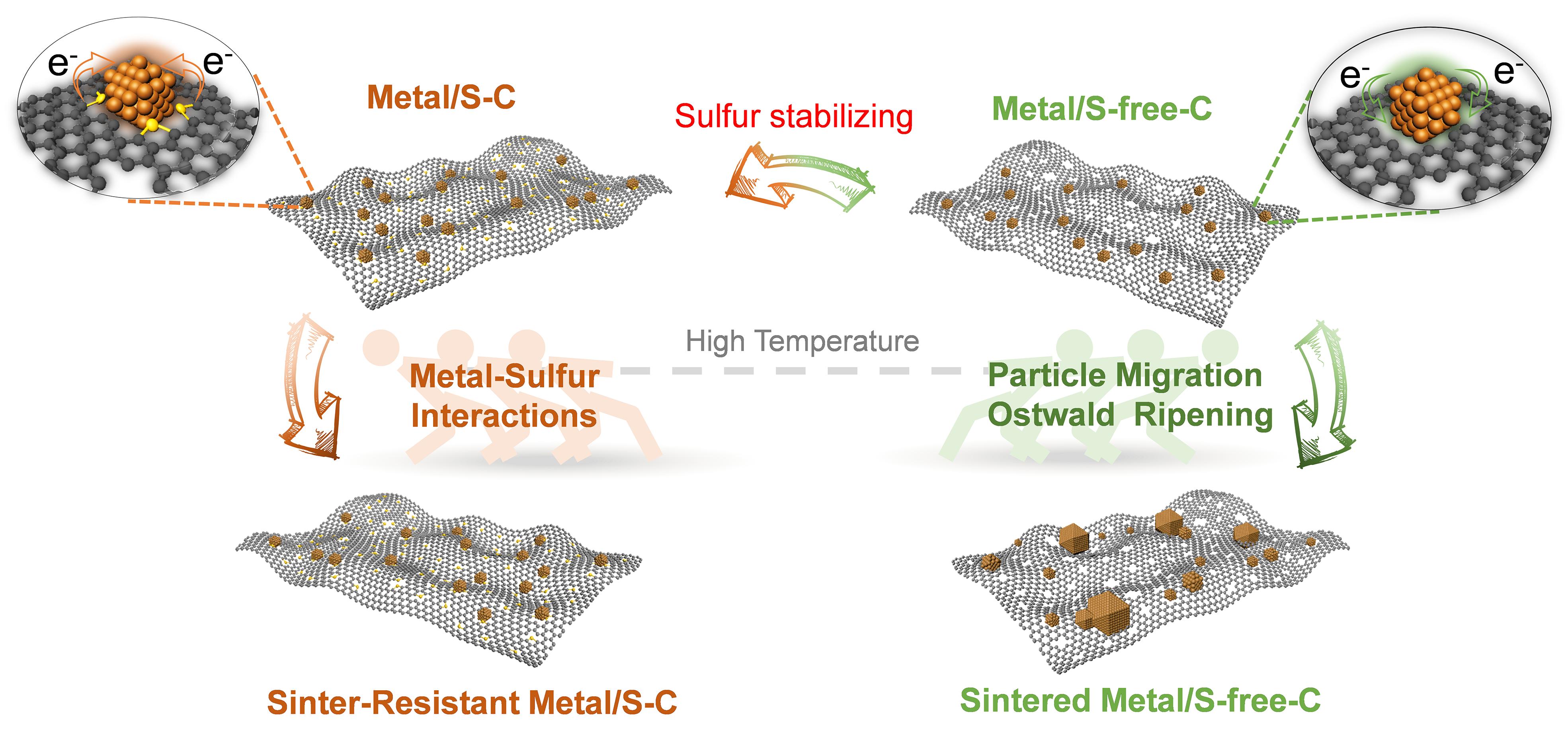 图1.高温下硫稳定策略抑制金属纳米团簇烧结的示意图。