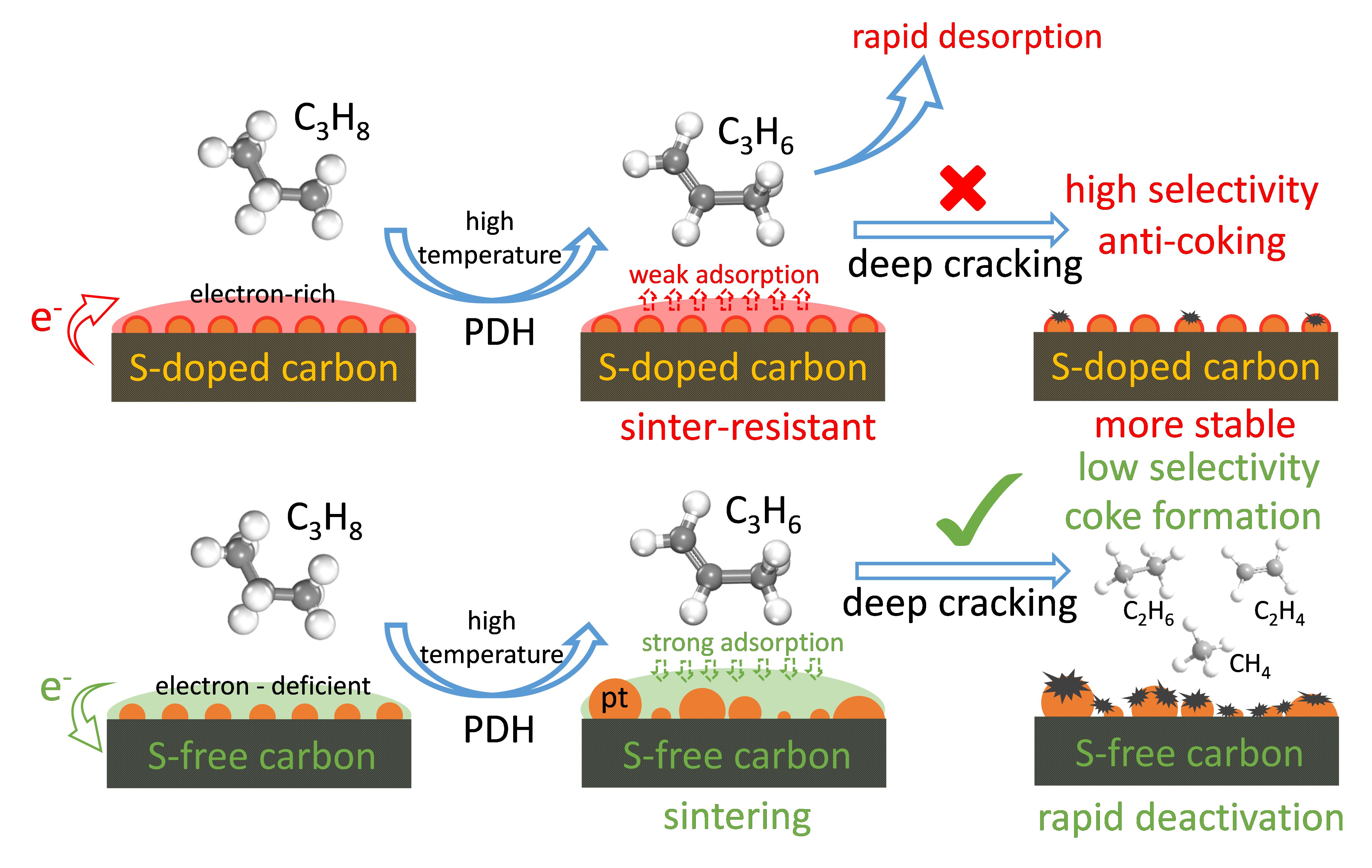 在多相催化领域,负载型金属纳米团簇催化剂因其优异的催化性能而受到广泛关注。然而在高温催化反应中,金属纳米团簇极易因颗粒烧结长大而快速失活。近日,中国科学技术大学梁海伟教授、武晓君教授以及路军岭教授等课题组进行实验和理论相结合的合作研究,发现当把一种传统认为是催化毒化剂的硫元素掺入碳载体中能够在高温下稳定金属纳米团簇,展现出独特的抗烧结特性(图1)。在高温丙烷脱氢制丙烯反应中,该硫掺杂碳(S-C)负载Pt团簇催化剂展现出优异的丙烯选择性和稳定性。该研究成果以“Sulfur stabilizing metal nanoclusters on carbon at high temperatures”为题,发表在国际期刊Nature Communications上。中科大研究生尹鹏、罗霄、马严富为论文的共同第一作者。