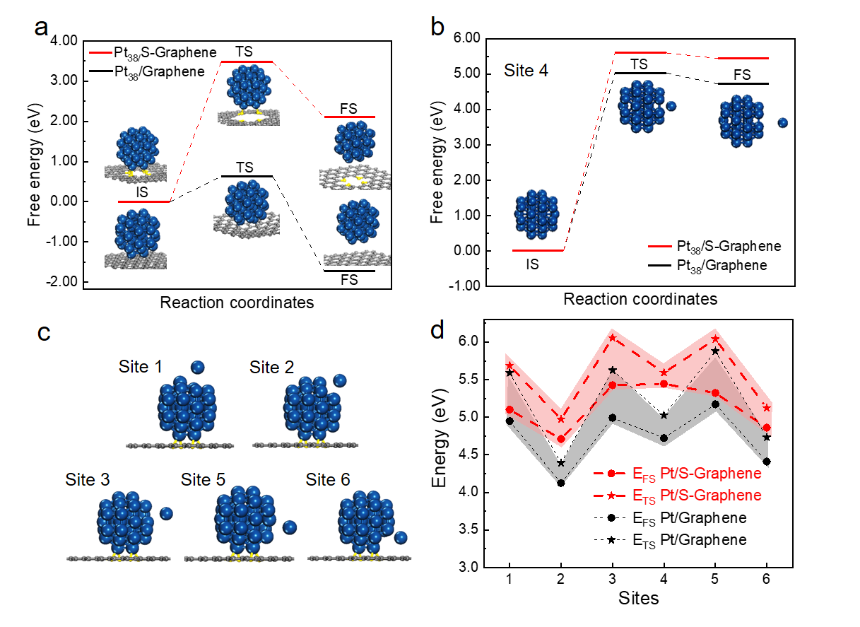 通过理论模拟烧结过程发现,金属和S-C之间的强相互作用直接增大了团簇的迁移能垒,进而抑制了金属的迁移和聚集烧结机制;此外,该Pt-S界面键合作降低了金属团簇的表面能,增加了单个原子从团簇逃逸的能力,从而可能减缓奥斯瓦尔德熟化过程(图3)。进一步,研究人员探究了上述催化剂的高温丙烷脱氢制丙烯性能。实验结果表明,具有富电子特性的Pt/S-C的丙烯选择性和稳定性明显优于缺电子Pt/S-free-C催化剂。理论计算表明,硫向Pt团簇的电荷转移,导致Pt上的电子富集,加快对丙烯的脱附(电荷排斥),防止其进一步深度裂解形成积碳(图4)。原位热重实验证实了Pt/S-C催化剂上积碳的减缓,这将进一步提高催化剂的稳定性。该项工作阐述了一种制备高温抗烧结纳米团簇催化剂的新思路,并搞选择性、高稳定性烷烃脱氢催化剂的设计提供了一种基于界面作用调控的新途径。