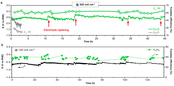 图2. 多层级高曲率铜电极长时间大电流CO2电解下的稳定性能。
