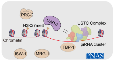 然而,piRNA的转录生成加工等过程仍然有许多重要的、未解决的问题,piRNA转录机器在高度异染色质化区域起始piRNA转录延伸的分子机制还不清楚。冯雪竹和光寿红课题组通过传统遗传学手段克隆了一个参与piRNA生成的基因uad-2,并通过分子生物学、细胞生物学等多种手段揭示了UAD-2蛋白通过调控USTC复合物与piRNA的转录起始过程来参与piRNA的生成。UAD-2蛋白具有Chromo结构域,课题组通过体外实验证明了该蛋白的Chromo结构域具有结合H3K27me3的活性。同时还揭示了参与H3K27me3修饰生成的PRC2复合物和染色质重塑因子ISW-1、MRG-1蛋白等对piRNA的生成也十分重要,为进一步研究异染色质区域的piRNA转录提供了新思路。