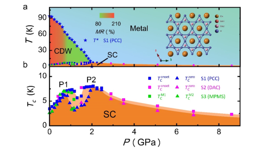 传统超导和CDW是两种不同的电子态,两者都起源于电声子耦合和费米面失稳。在传统的CDW和超导共存图像中,进入CDW态后,由于费米面的嵌套而打开能隙,从而导致态密度的丢失,表现出CDW与超导相竞争的行为。人们可以通过增加压力或化学掺杂等手段压制CDW态,超导临界转变温度Tc随着CDW态压制会展现出单穹顶状的行为。而在具有笼目结构的化合物中,由于强的几何阻挫,理论预言会出现更多新奇的量子物态,包括非传统超导态和手性密度波等。最近人们发现了一种新型的层状笼目结构超导体CsV3Sb5,同时该超导体具有94K的CDW转变温度,这为人们提供了一个理想的平台来研究其中的CDW形成机制及其与超导之间的关联。