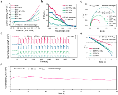 2. 光阳极的PEC性能。(a, b)BST-MHs、BST-NTs、BST-NSs和BST-NTs + BST-NSs光阳极的电流-电压曲线(a)和IPCE(b)。(c)不同光阳极的电化学阻抗谱。(d,e)BST-MHs、BST-NTs、BST-NSs和BST-NTs + NSs光阳极在NIR光下的瞬态电流-时间曲线(d)和瞬态电流分析曲线(e),测试电压为0.60 VRHE。(f)BST/CoSeTe-2%光阳极的稳定性测试。