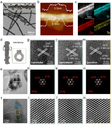 1. BST-MHs的形貌与组分表征。(a)BST-MHs的TEM图像。(b)BST-MHs的AFM图像。(c)BST-MHs的暗场STEM图像和EDS元素面分布图像,选取的为Bi-M(蓝色),Se-K(红色)和Te-L(黄色)信号。(d)BST-MHs的切片示意图。(e, f)界面处的TEM图像和HRTEM图像。(g, h, i)图c中绿框内纳米管的HRTEM图像、FFT图像和反转FFT图像。(j, k, l)图c中蓝框内纳米片的HRTEM图像、FFT图像和反转FFT图像。(m, n, o)图c中黄框内界面的HRTEM图像、FFT图像和反转FFT图像。