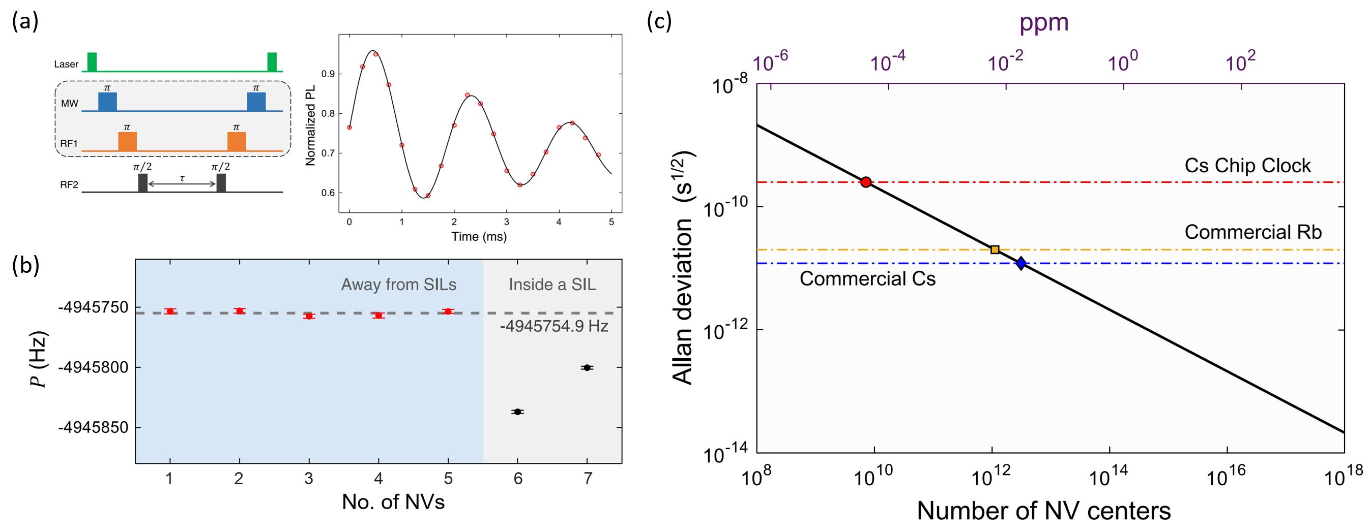 图:(a):实验探测序列及拉姆齐干涉结果;(b):全同性检验结果:四极矩耦合参数的测量结果,前五个为远离固体浸没透镜的色心,后两个为固体浸没透镜内的色心,在金刚石上加工固体浸没透镜会产生局域应力导致色心产生差异;(c):原子钟方案的Allan方差,黑实线为实验组提出的固态原子钟方案。