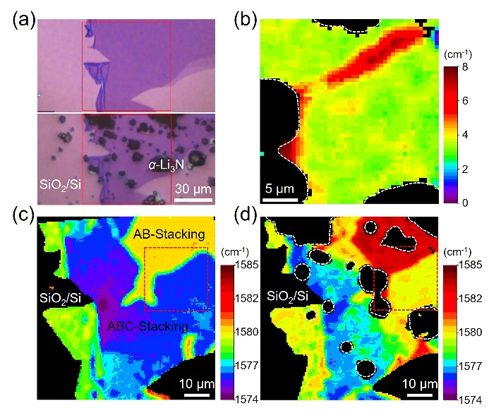 4. (a) Li3N颗粒覆盖前后机械剥离薄层石墨的光学照片;(b) 拉曼G峰位置差((d)中红色虚线方框强度减去(c)中红色虚线方框强度)的扫描图像;(c) Li3N颗粒覆盖时薄层石墨拉曼G峰扫描图像;(d) Li3N颗粒覆盖时薄层石墨同一区域拉曼G峰扫描图像。