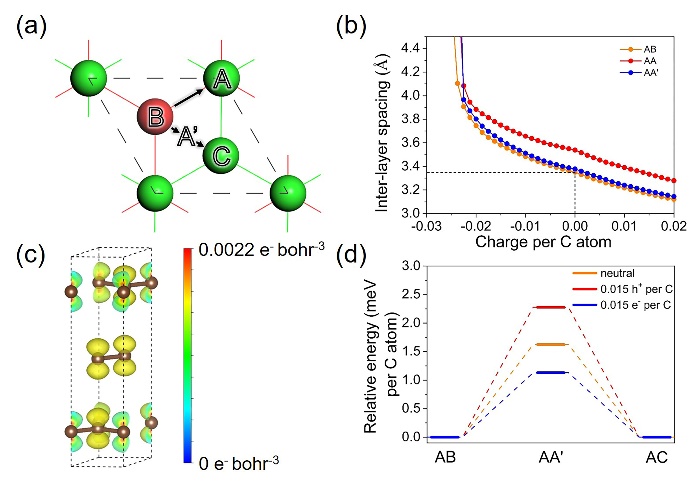 3. (a) AB堆叠滑移至AC堆叠的两种可能滑移路径;(b) AB, AAAA’堆叠石墨的层间距随电荷注入量的变化;(c)电荷注入时3R堆叠石墨的电荷差分密度;(d) 不同电荷注入条件下石墨的层间滑移能垒变化。