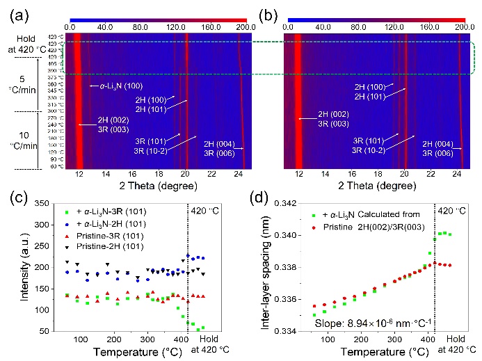2. (a)(b)有无Li3N存在时石墨加热过程中原位XRD结果;(c) 有无Li3N存在时石墨3R(101)2H(101)峰强度随温度的演变;(d) 有无Li3N存在时石墨层间距随温度的演变