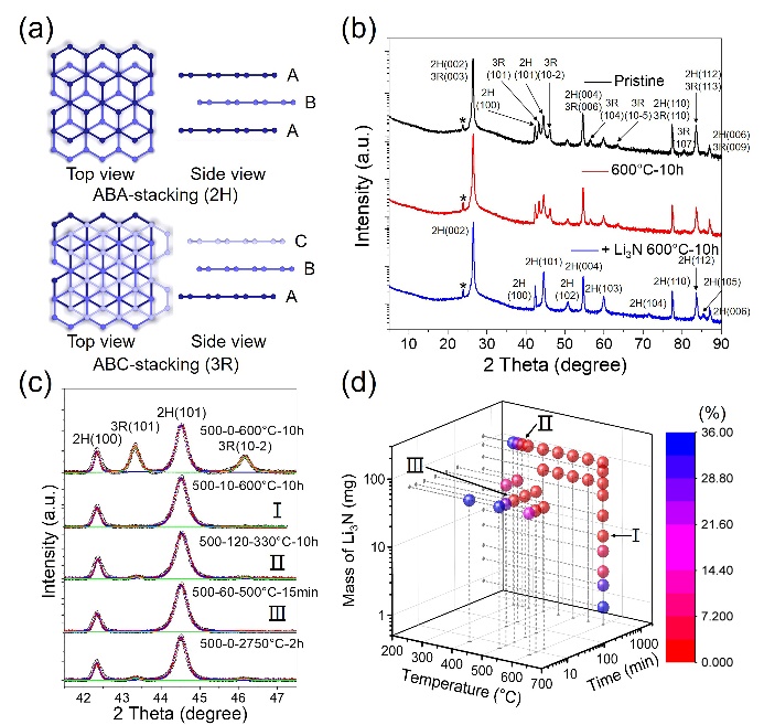 1.(a) 2H相和3R相石墨的原子模型;(b) 初始石墨以及有无Li3N存在时热处理后的XRD(c) XRD拟合以区分3R2H相;(d)反应条件与石墨中剩余3R相比例相图
