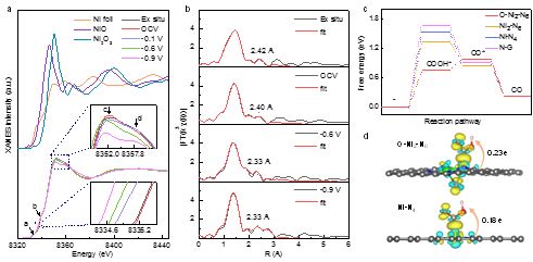 原位同步辐射X射线吸收精细结构谱技术清晰地揭示了Ni2位点在电催化CO2还原反应中原子和电子结构的动态演变。结果表明,初始的Ni2-N6结构吸附电催化环境中的含氧官能团,从而形成O-Ni2-N6结构,同时在反应过程中伴随着Ni原子间距缩短和相互作用增强。理论计算表明,经过动态演变形成的关键O-Ni2-N6结构会显著降低CO2分子活化的能垒,使得双核Ni2催化剂表现出优异的电催化CO2还原制CO性能。这项研究不仅提供了双核位点催化剂的精准制备方法,还从精确的原子水平上理解了双核位点的结构演变和催化机制,为设计和调控高性能的双原子甚至多原子催化剂提供了理论和实验基础。