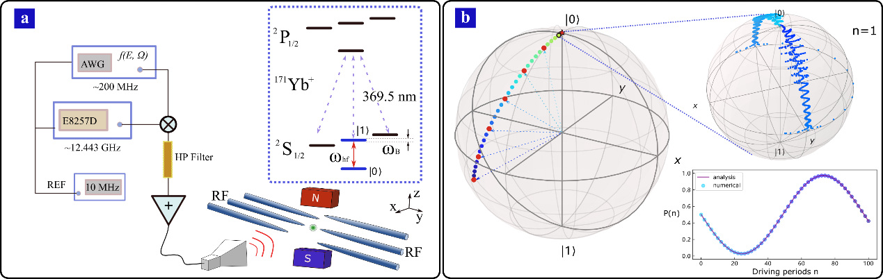 该联合研究团队在国际上首次提出了一种准静态哈密顿量方法。通过设计一种驱动函数周期性地驱动量子比特,能够实现量子态的准静态演化,使得当系统的准能量等于黎曼函数零点时,该量子系统在整数周期节点保持不变,即发生相干隧穿抑制(Coherent destruction of tunneling)。该团队在自主研发的囚禁离子阱中率先实现了该方案。得益于该离子阱系统的长相干时间,研究团队实现了30个周期的高保真度驱动,并测量到了黎曼函数的前80个零点,比该领域此前的工作提升了近两个量级。该实验结果对于人们研究希尔伯特-波利亚猜想,并深入理解黎曼猜想与量子系统的联系提供了重要的实验依据。