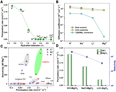 为了进一步研究亚2-nm通道壁面化学环境对于离子传质与分离性能的影响,团队通过界面生长策略构筑具有1D垂直贯通亚2-nm通道的超薄(~20 nm)COFs膜,利用N2和空气氛围中的升温红外表征,证明了通道内氢键位点能与水分子形成氢键相互作用。离子在溶液中是以水合形式存在,不同离子对水壳层中水分子的结合力不同,因此,离子水壳层中的水分子与COFs通道中氢键位点形成不同的氢键作用(图1)。构筑的COFs膜(TpBDMe2)表现出高的一价阳离子渗透速率(0.1 ~ 0.2 mol m?2 h?1)和极低的多价阳离子透过率,实现了高的离子选择性,比如K+/Mg2+的选择性~765,Na+/Mg2+的选择性~680,Li+/Mg2+的选择性~217,显著优于已报道的亚2-nm通道膜(图2)。理论模拟表明二价阳离子通过COFs膜通道的能垒高于一价阳离子,1D亚2-nm通道促进了一价阳离子的快速渗透,而二价阳离子与通道之间更强的氢键相互作用促成了离子的高选择性。该项研究表明构建具有丰富氢键位点的COFs多孔膜,在保持离子渗透速率的同时,能显著提高离子选择性。本工作不但为离子在亚2-nm受限空间中的传输机制提供了理论基础,同时也为聚合物基离子选择性分离膜的结构设计与调控提供了理论指导。