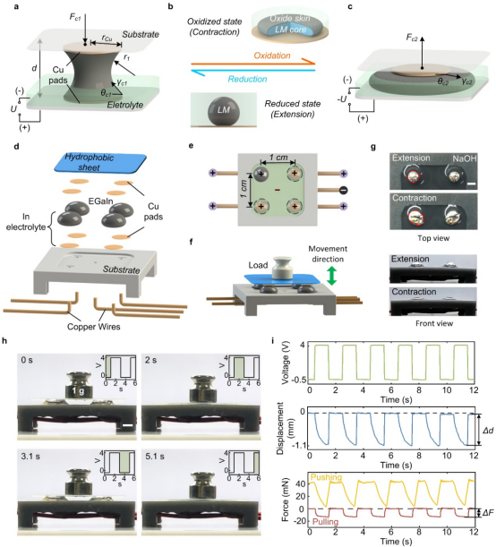 近年来,镓基液态金属由于其卓越的物化特性成为一大研究热点。镓基液态金属兼具液体和固体的一些特性,包括高电导/热导率,良好的柔性,毒性极低且不易挥发。此外,镓基液态金属极易被氧化形成表面氧化膜,未被氧化时,液态金属具有目前已知液体中最大的表面张力(>600mN/m),氧化后,液态金属的表面张力可降至接近0。联合研究组利用电化学方法快速、可逆地实现这两种状态的切换(图1a - c),同时,研究组通过机构设计,构造液桥,将液态金属液滴状态切换过程中的形态变化转化为驱动行程及驱动力。如图1d所示,液滴上下两端布置铜电极,其不仅为液滴提供氧化/还原电压,铜和液态金属优异的润湿性还使得液滴能被锚定在铜片上。液态金属液滴在上下铜电极之间形成液桥,电极提供氧化电压时(+4V),液滴从近球状变成扁平泥状,液桥对上基底的作用力向下,液桥高度降低,人工肌肉“收缩”;电极提供还原电压时(-0.5V),液滴从扁平泥状恢复成近球状,液桥对上基底的作用力向上,液桥恢复初始高度,人工肌肉“舒张”。在0.25Hz电压(4V到-0.5V)驱动下,人工肌肉能提供约20mN的拉力,40mN的推力,超过1mm的驱动行程(图1i)。