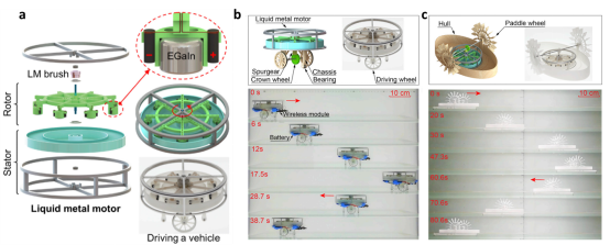 此外,联合研究组还基于液态金属的电致驱动成功研制了一种无需任何常规电磁器件的液态金属电机(图4a),该电机利用电场在液态金属液滴两侧形成表面张力差,驱动电机转子旋转,输出力矩;为了克服传统固-固接触电刷摩擦力大,磨损消耗快,产生火花造成安全隐患等缺陷,研究人员还利用液态金属优异的导电性和较低的粘度,设计了一种固-液接触的液态金属电刷,该电刷能避免导线缠绕,有效保证电路连通,同时,其转动阻力比常规电刷小一到两个数量级。研究人员还展示了利用该电机驱动小车和小船分别在陆地和水中运动的应用(图4b , c)。该项工作有望弥补传统驱动器件的缺陷,启发液态金属在柔性机器人、微机电系统、柔性电子等领域的应用和发展。相关成果以 “Liquid Metal Motor”为题发表在Cell子刊 iScience上,并被Matter期刊作 Preview介绍。