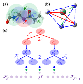 图1:(a)递归嵌入原子神经网络模型的示意图显示了密度描述符是如何递归嵌入的;(b)以CH4为例展示了如何通过两次迭代实现以C为中心的完备五体相互作用;(c)图示说明每次迭代三体项的数量如何增加。