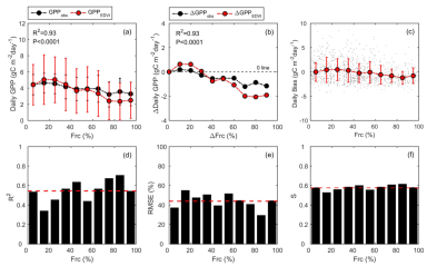 图1:站点实测GPP与(a)基于微波EDVI,(b)基于MODIS光学的NDVI,FPAR和LAI植被指数的FPAR相关性对比。(e)站点实测GPP与微波和光学植被指数在不同云盖条件下的相关性。