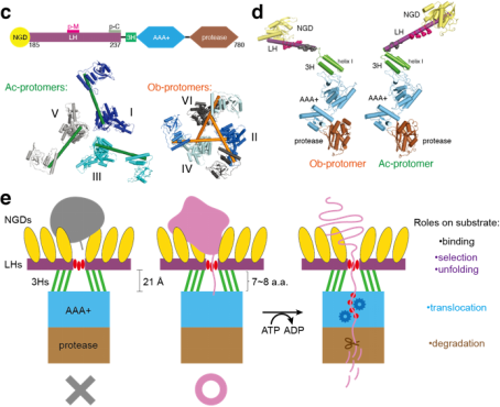 全长Lon的冷冻电镜结构解析。a.冷冻电镜结构。b.三维原子模型。c,d.二类单体的结构及结构域示意图。e.作用机制示意图。