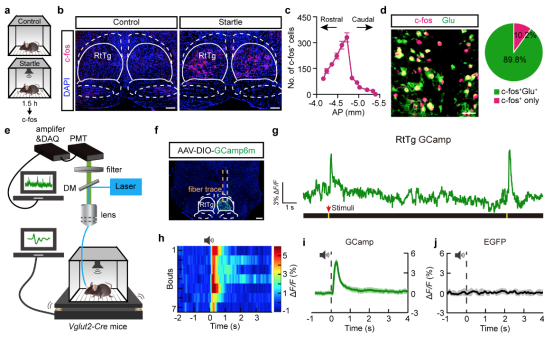 图1.声音刺激诱发惊跳反射时,小鼠RtTg内谷氨酸能神经元被激活