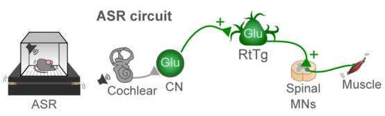 图2. CN-RtTg-spinal MNs环路介导声音诱发的惊跳反射行为