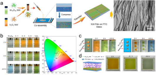 图1.基于W18O49和V2O5纳米线共组装构筑多色显示器件及其性能调控