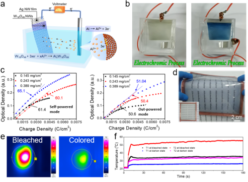 图2.基于Ag和W18O49纳米线构筑的自供电柔性电致变色智能窗口