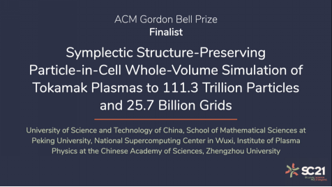 当地时间11月16日下午,中国科大入围国际戈登?贝尔奖评选的超算应用成果 “Symplectic Structure-Preserving Particle-in-Cell Whole-Volume Simulation of Tokamak Plasmas to 111.3 Trillion Particles and 25.7 Billion Grids”,参加了在美国密苏里州圣路易斯召开的全球超级计算大会(SC21)的线上答辩,报告了中国科大在新一代神威超级计算机上首次实现EAST(先进实验超导托卡马克)和CFETR(中国聚变工程试验堆) “聚变堆全装置动理学等离子体演化模拟”,这是中国科大首次作为第一完成单位入围戈登?贝尔奖评选。戈登?贝尔奖是国际上高性能计算应用领域的最高学术奖项,被称为“超算领域的诺贝尔奖”,由ACM(美国计算机学会)每年评选和颁发,具有巨大的国际影响力。此前,在10月22日举办的CCF(中国计算机学会)高性能计算学术年会(HPC China 2021)上,该成果获得了2021年首届“年度中国高性能计算最佳应用奖”。此项成果由核科学技术学院肖建元副研究员课题组与计算机科学与技术学院安虹教授课题组联合攻关,在中国科学院合肥物质研究院等离子体物理研究所、中国科学院数学与系统科学研究院、国家超级计算无锡中心、北京大学和郑州大学相关研究人员的紧密配合下完成。