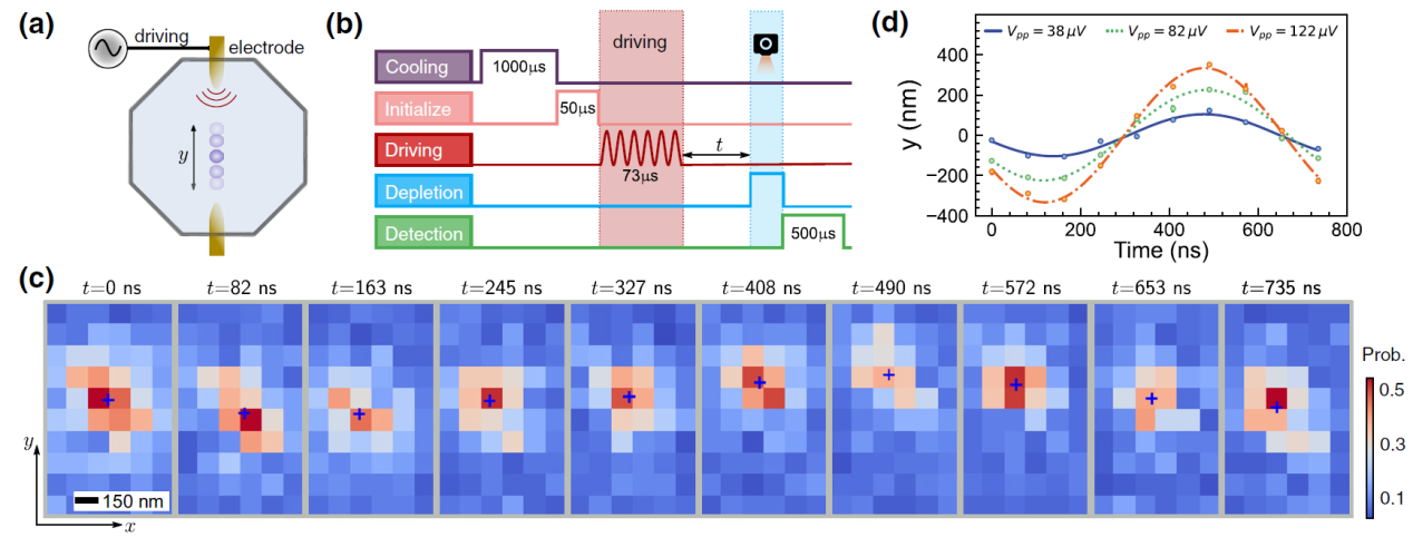 2超分辨成像方法应用于离子动力学测量。(a)采用电信号激励离子y方向简谐运动,(b)成像时许,(c)对运动离子不同时刻的成像,拟合像斑中心(蓝色十字)可以清晰观测y方向的简谐振动。(d)不同激励电压的离子运动轨迹。